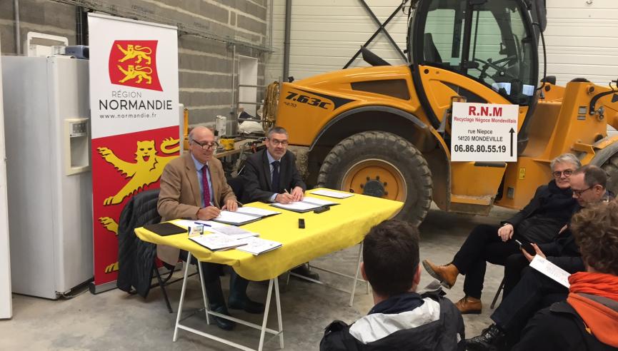 Recyclage Négoce Mondevillais, l’entreprise gestionnaire de la plateforme de recyclage des déchets du BTP a pour sa part bénéficié d’une aide à hauteur de 10 000 € au titre du dispositif « Impulsion Environnement » et d’un prêt à taux nul d’un montant de 40 000 € de la Région Normandie et d’une aide à hauteur de 56 000 € de la part de l’ADEME.